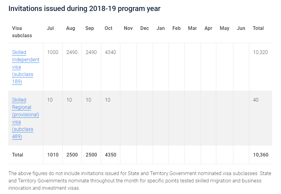2018-19年度截至本輪:189獨立技術移民共邀請了10320人,489偏遠地區親屬擔保為40人。