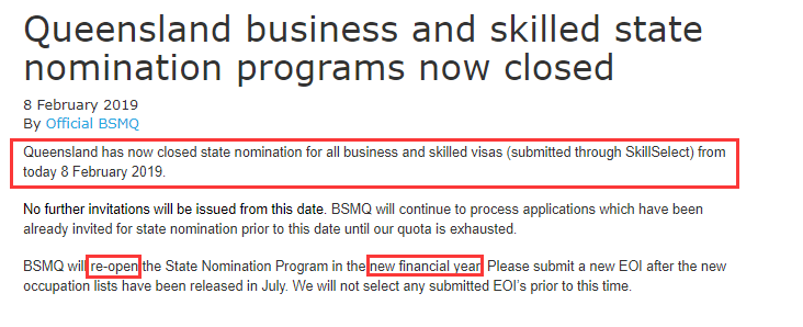 BSMQ表示本次關(guān)閉的原因是聯(lián)邦政府分配的州擔(dān)保配額已經(jīng)用完,若您截至2月8日還未收到邀請,2018-2019財年內(nèi)昆州將不會再發(fā)放新的邀請了。