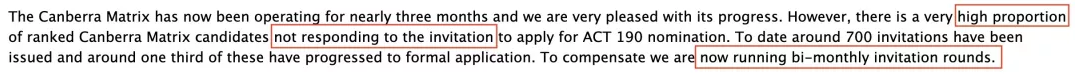 Canberra Matrix系統目前已經運作了將近3個月,發放了5輪約700個邀請,其中只有三分之一正式獲邀,大部分沒有回應。作為對其他沒受到邀請的申請人一個補償,ACT州政府決定將邀請輪次改為每月兩次!
