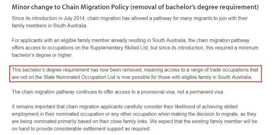 之前的親屬擔保要求申請者至少有本科以上的學歷。本次調整之后,取消了學歷要求,這將大大利好于那些Tafe畢業的學生。因為這意味著申請人終于有資格申請南澳SNOL清單外的大量trade 職業。只要有親屬在南澳居住,就可以通過親屬擔保移民來澳與家人團聚。