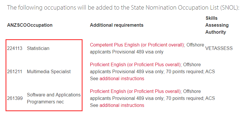 261399其他軟件和應(yīng)用程序員:要求英語(yǔ)達(dá)到雅思每個(gè)單項(xiàng)7分或總分7.5分;海外人士只能申請(qǐng)489州擔(dān)保;這個(gè)職業(yè)要求EOI分?jǐn)?shù)70分,也就是說(shuō)海外申請(qǐng)人需要自身EOI達(dá)到60分才能申請(qǐng)南澳489擔(dān)保(489擔(dān)保可為申請(qǐng)人加10分即可達(dá)到EOI70分的要求);
