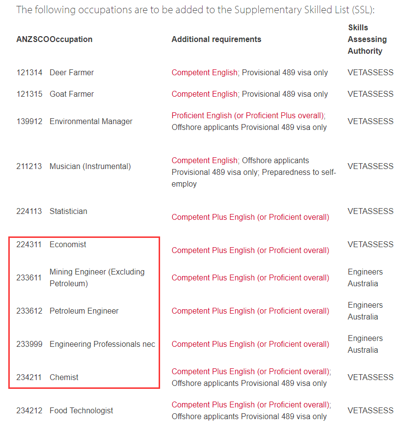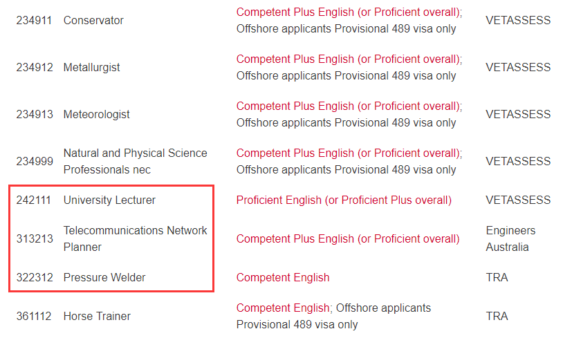 與移民局職業(yè)調(diào)整保持一致,經(jīng)濟(jì)學(xué)家、采礦工程師、石油工程師、其他工程專業(yè)人員、大學(xué)講師、電信網(wǎng)絡(luò)規(guī)劃師、壓力焊工等職業(yè)被新增進(jìn)入SSL表。