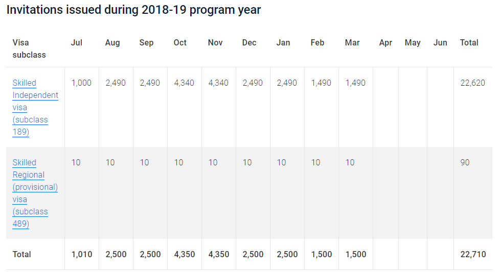 2018-19年度截至本輪:189獨立技術移民共邀請了22620人;489偏遠地區親屬擔保共邀請90人。