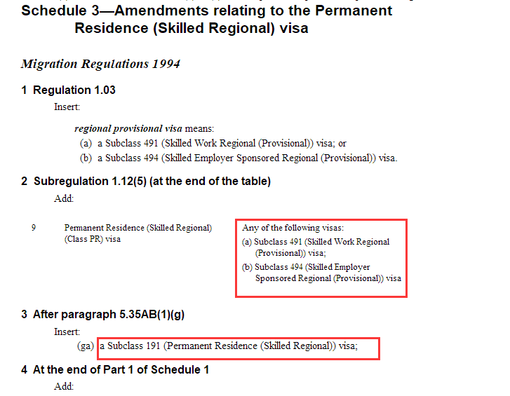 立法條約中明確說明,新偏遠地區技術491簽證和新偏遠地區雇主擔保494簽證可以轉永居,新的永居簽證名稱為191簽證。