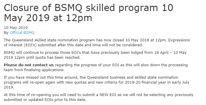 昆士蘭州擔(dān)保已于5月10日12pm關(guān)閉,等候7月份2019-20新財年分配到新配額再重新開放。本次開放4月18日——5月10日12pm期間遞交的申請,昆州政府會繼續(xù)審理直至額滿,請在此時間段內(nèi)已遞交的申請人不要擔(dān)心。錯過時機的申請人請等候新財年再遞交新的EOI。