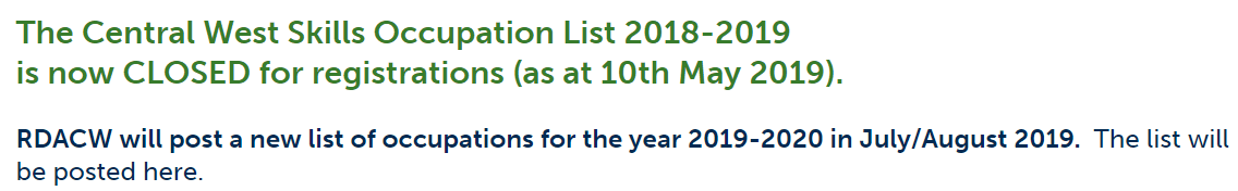 Central West地區(qū)已于5月10日關(guān)閉489州擔(dān)保通道,等候2019-20新財年再重新開放。屆時會發(fā)布新的職業(yè)列表。