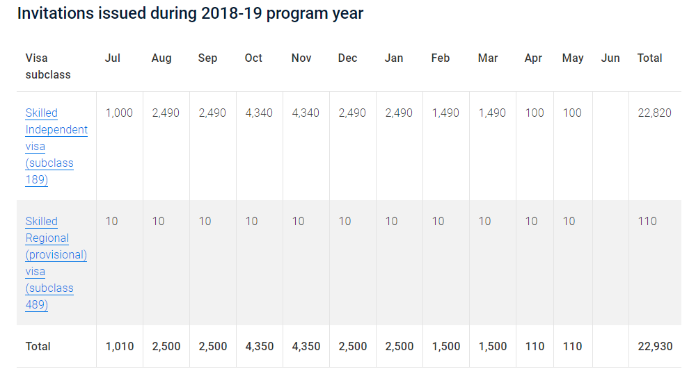 2018-19年度截至本輪:189獨(dú)立技術(shù)移民共邀請了22820人;489偏遠(yuǎn)地區(qū)親屬擔(dān)保共邀請100人。