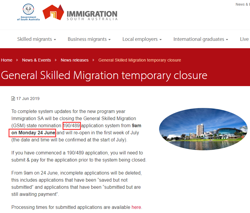南澳州政府這么做也是為了新財(cái)年的移民計(jì)劃做準(zhǔn)備。如果您已經(jīng)開始申請(qǐng)190州擔(dān)保或489州擔(dān)保,那么您需要在系統(tǒng)關(guān)閉之前提交并支付申請(qǐng)費(fèi)用才算是正式完成遞交。