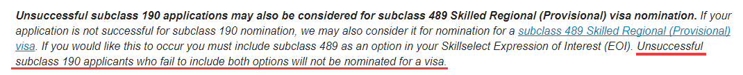 塔州政府表示190提名不成功的申請他們也會酌情考慮是否給予489,但你必須在遞交190 EOI的時候同時也把489勾選上。否則一旦190提名被拒的話,489也沒機會了。