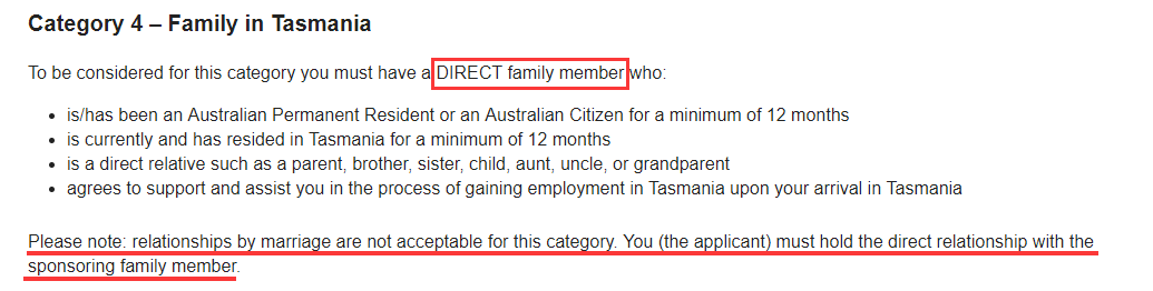 如果申請人有親屬是澳洲PR或者澳大利亞公民,并且定居在塔州至少12個月且愿意為你提供擔保的話,可以申請塔州489,但是塔州政府明確表示,這個親屬必須是申請人自己的直接親屬,不能是基于婚姻關系的親屬,比如是配偶的親屬。