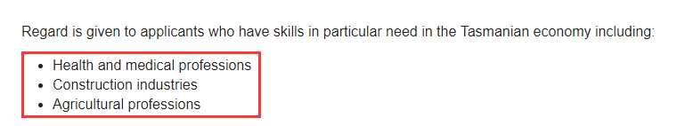 塔州州擔保職業清單直接反映塔州緊缺技能需求,目前塔州職業清單TSOL還是2019年3月16日的版本。不過政府現在明確表示以下3大類職業的申請人會優先考慮:健康與醫療類、建筑類、農業類。
