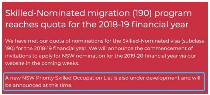 NSW 190州擔保由于已經達到預計上線,目前已經關閉!此外,今日得知的消息表示:新財政年190州擔保職業清單正在制定當中,并將很快宣布。