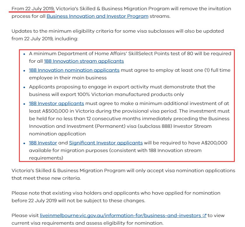 注意:如果在2019年7月22日前已經獲取了上述188類簽證或已經遞交了維州政府提名申請的申請人將不會受到上述新政的影響。