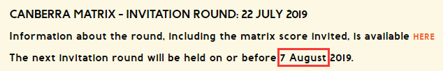 在Matrix評分系統獲得邀請只是獲得堪培拉州擔保的第一步,希望獲得邀請的朋友盡快將全部相關材料準備好去遞交堪培拉190州擔保申請,并支付審理費。請注意:必須是在14天內遞交全部相關材料,否則邀請將作廢。