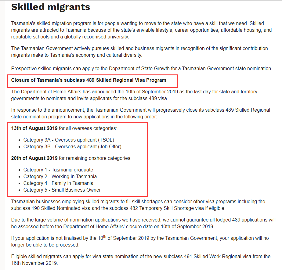 2019年9月10日,是澳洲移民局公布的各州政府489邀請最后發(fā)放日,為了配合這一過渡安排,塔州政府將逐漸關(guān)閉489州擔(dān)保提名申請,具體安排如下: