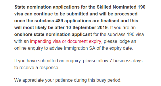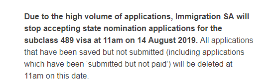 南澳州政府表示,因為收到了大量的489州擔保申請,南澳州政府將會在8月14日上午11點停止接受所有489州擔保申請。所有未提交的申請將會在上午11點過后被系統自動刪除。