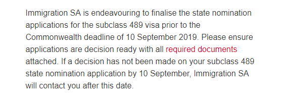 南澳州政府希望所有申請人盡快上傳所有必須提供的文件,能讓南澳州政府及時處理所有489州擔保申請,以便在移民局要求的9月10日前發放邀請給所有申請人。