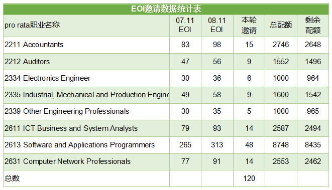 我們通過職業配額統計出八大熱門職業共邀請了120個,但是189一共也只有100個邀請。所有189和489親屬擔保是共享職業配額的,所以本輪有不少職業有489親屬擔保的獲邀請。