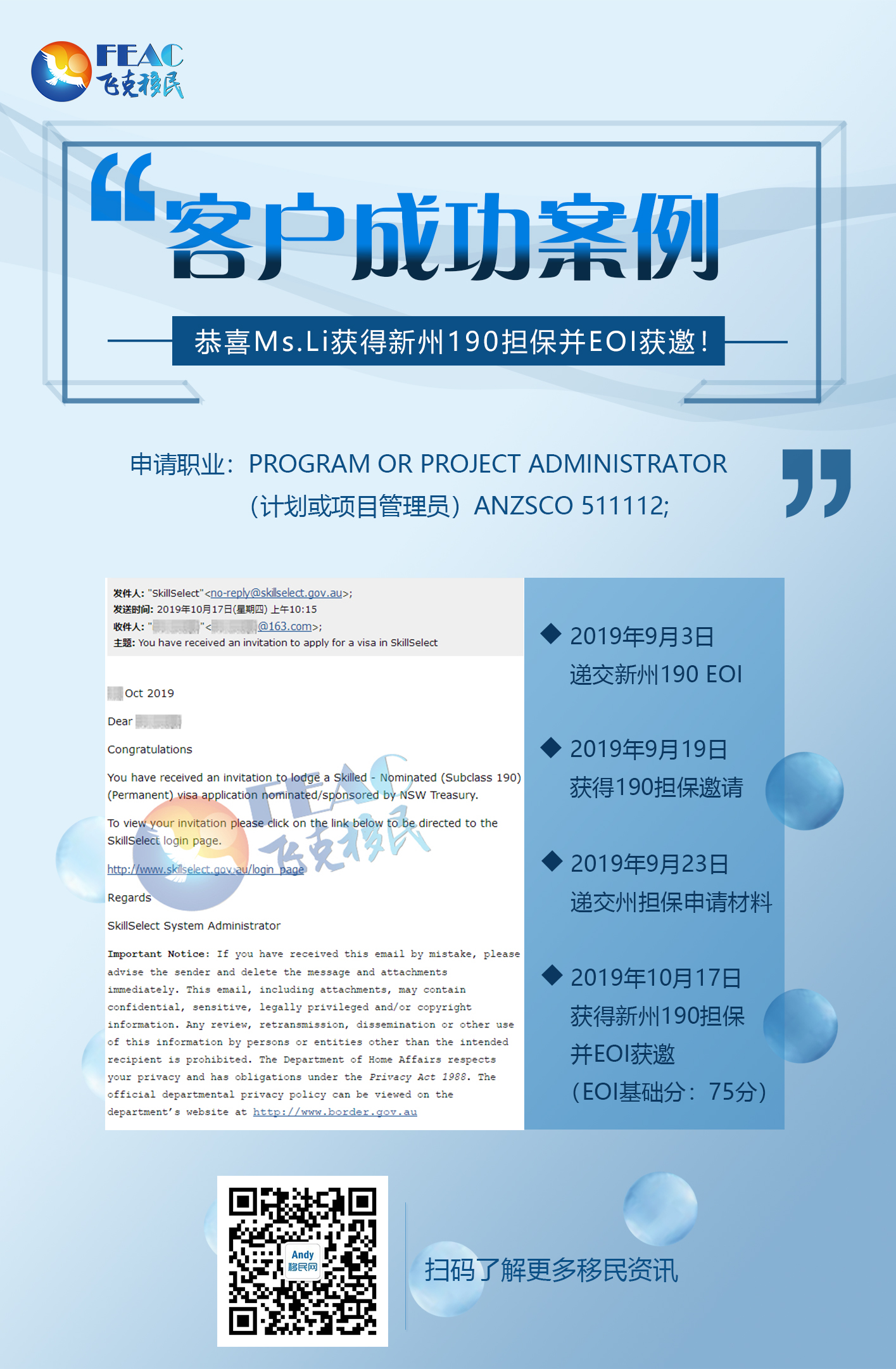 對(duì)于移民朋友來(lái)說(shuō),沒(méi)有什么比獲得邀請(qǐng)更珍貴了。感謝客戶(hù)的信賴(lài),才能夠在短時(shí)間內(nèi)拿到新州190的邀請(qǐng)。小編不禁再次恭喜獲邀的客戶(hù),你們都棒棒噠!