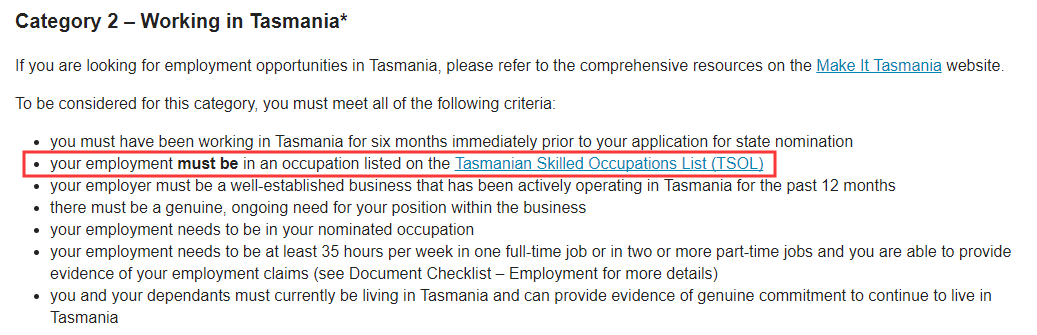 l 在遞交州擔保申請前,申請人至少在TAS工作6個月,至少35小時/周(可以全職,也可以多個兼職累計),工作需要跟提名職業相關;