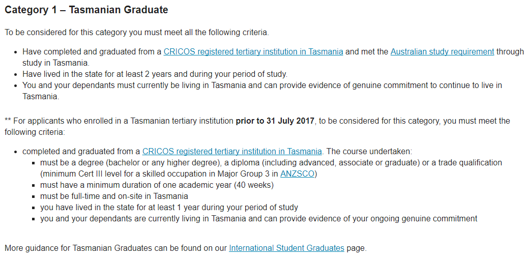 l 在塔州本地完成全日制CRICOS注冊課程,時長至少2學年(80周),學歷等級為本科及以上,diploma(advanced,associate or graduate)或者技工課程(至少Cert III level, ANZSCO Major Group 3中的技工職業);