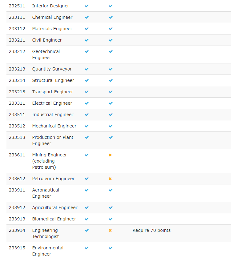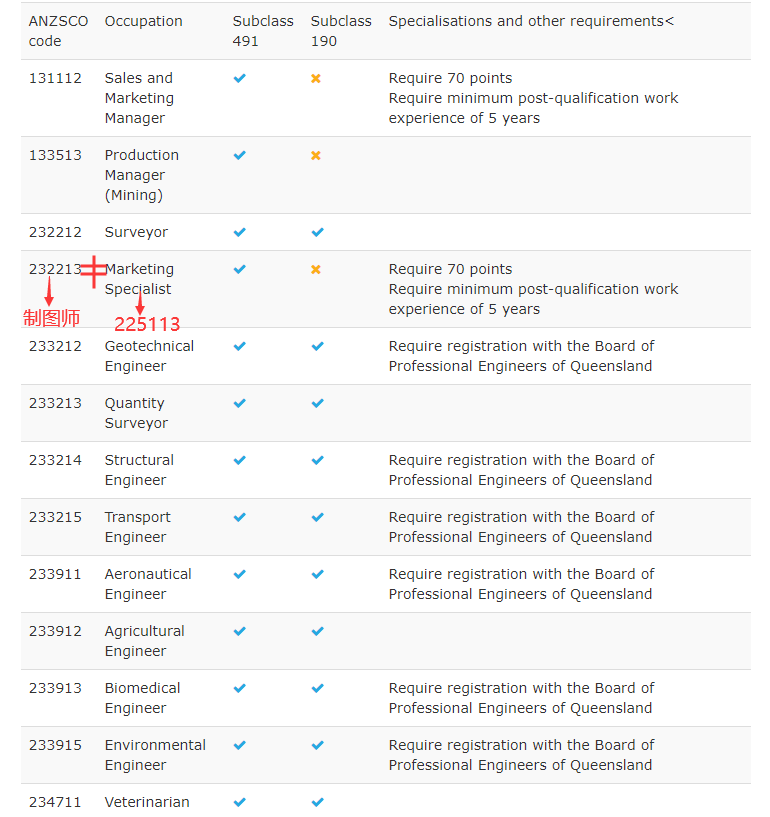 更新后的offshore清單僅剩少數幾個工程職業,如巖土/結構/交通/航空工程師,IT類職業也不多了,而且都有注冊或工作經驗的要求(ICT職業要求80分)。另外請注意:是官網更新人員筆誤嗎?232213對應的職業是制圖師,Marketing Specialist對應的職業代碼是225113。此處錯誤,遞交需注意。這個職業需EOI 70分,5年工作經驗,僅可申請491,不能190。