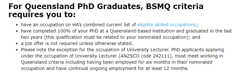 包含碩士畢業生和博士畢業生。碩士畢業生提名職業需要Master畢業生職業清單,博士畢業生提名職業只要在移民局技術移民清單即可。需要是近2年內在昆士蘭境內高校100%完成了提名職業的碩士/博士學位。博士畢業生可豁免job offer(大學講師除外)。