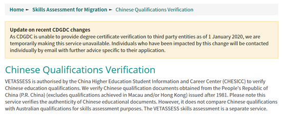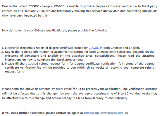 由于CDGDC(中國教育部學位與研究生發(fā)展中心)自2020年1月1日起無法向第三方實體提供學位證書驗證,VET官方暫時無法提供中國學歷認證服務。受影響的申請人可通過電子郵件與VET單獨聯(lián)系。