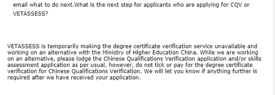 VET正在和中國高等教育部商討解決辦法。在此期間,大家可照常遞交VET中國學(xué)歷認(rèn)證和/或技術(shù)移民評估。不過,申請中國學(xué)歷認(rèn)證的話,請暫時(shí)不要勾選支付申請費(fèi)。他們收到申請后會(huì)告知你后續(xù)操作。