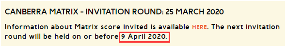 在Matrix評分系統(tǒng)獲得邀請只是獲得堪培拉州擔(dān)保的第一步,希望獲得邀請的朋友盡快將全部相關(guān)材料準(zhǔn)備好14天內(nèi)遞交正式的州擔(dān)保申請,并支付審理費(fèi),否則邀請將作廢。