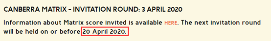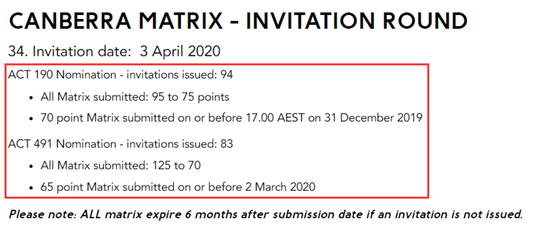 今日,ACT再次發放Matrix邀請。這已經是ACT連續六周發邀請了,發放頻率可人。ACT 190發了94個,所有75——95分都獲邀,70分的邀請進度精確到了2019年12月30日澳洲東部時間17點遞交的申請。491發了83個,所有70——125分都獲邀,65分邀請至2020年3月2日,較上輪再次推進半個月。