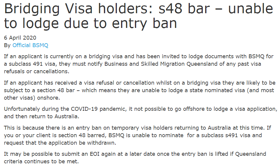 如果一個申請人在過橋簽證期間收到了拒簽或取消簽證的通知,他們可能會受到S48這條法案的限制——這意味著他們無法在澳洲境內提交通過州擔保提名的簽證。