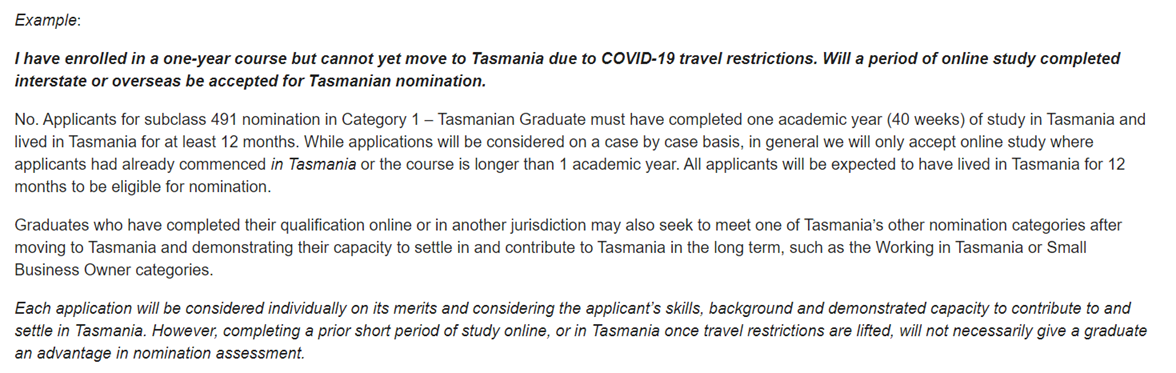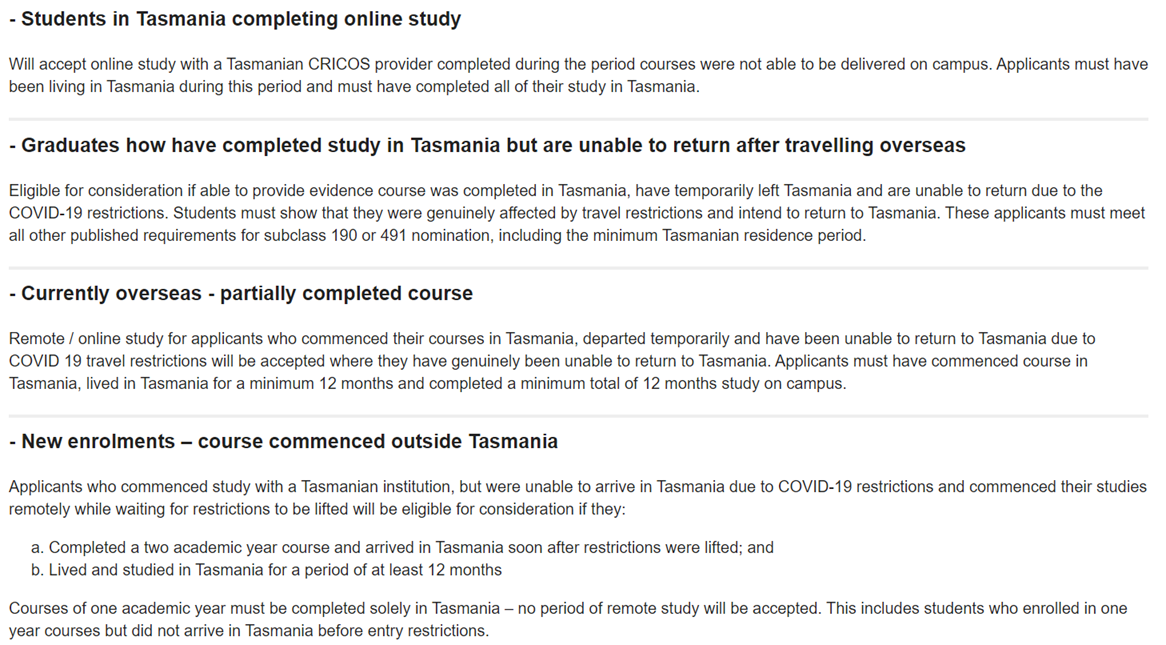 針對疫情期間無法在校園內完成課程的學生們,塔州政府接受CRICOS注冊課程的在線學習。190/491州擔保申請人必須在此期間一直居住在塔州,并且必須已完成在塔州的所有學習。