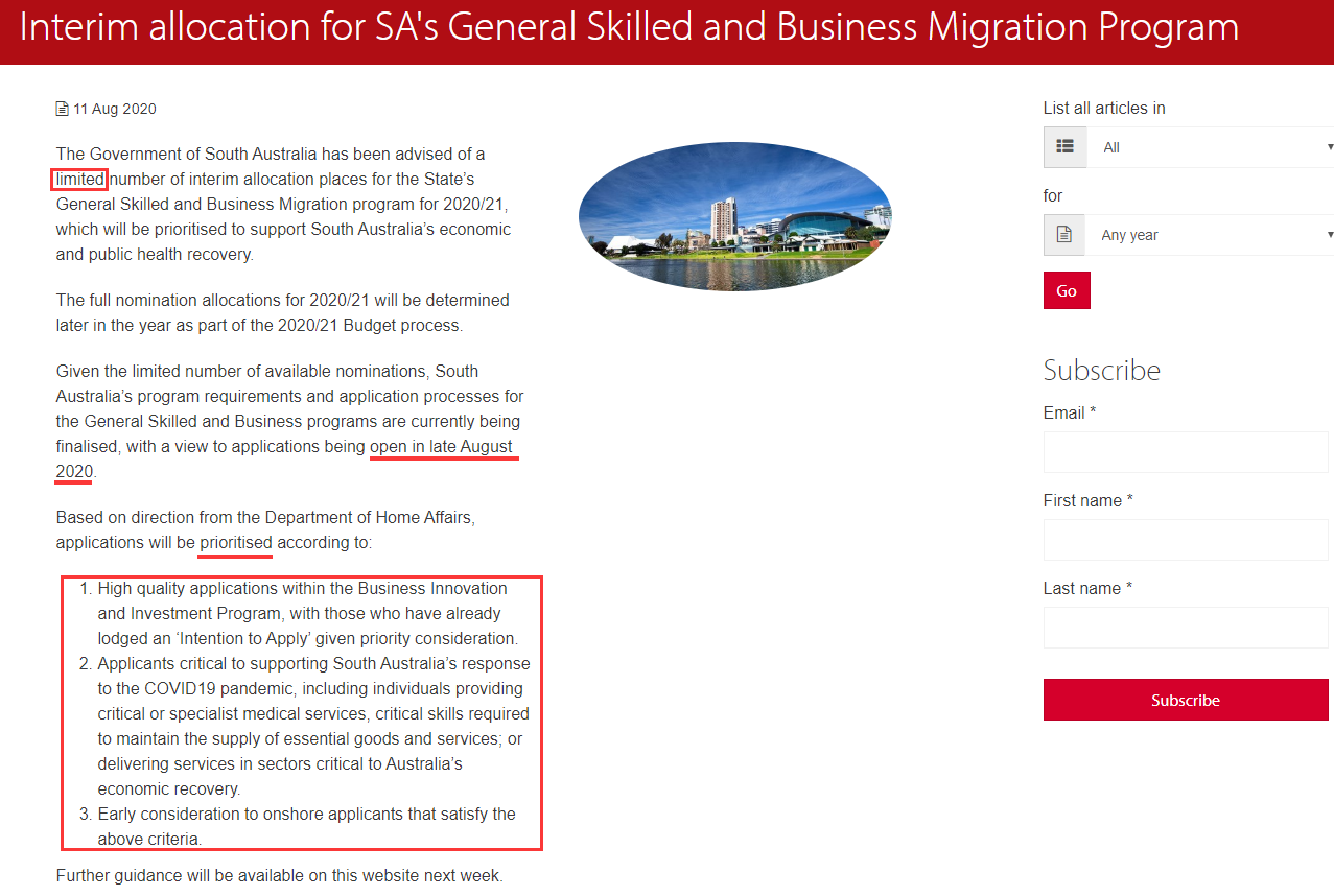 南澳州政府最新通知:SA政府已獲得2020-21財年過渡期技術移民和投資移民配額,但是配額有限,將優先用于支持南澳的經濟和公共衛生行業的復蘇。