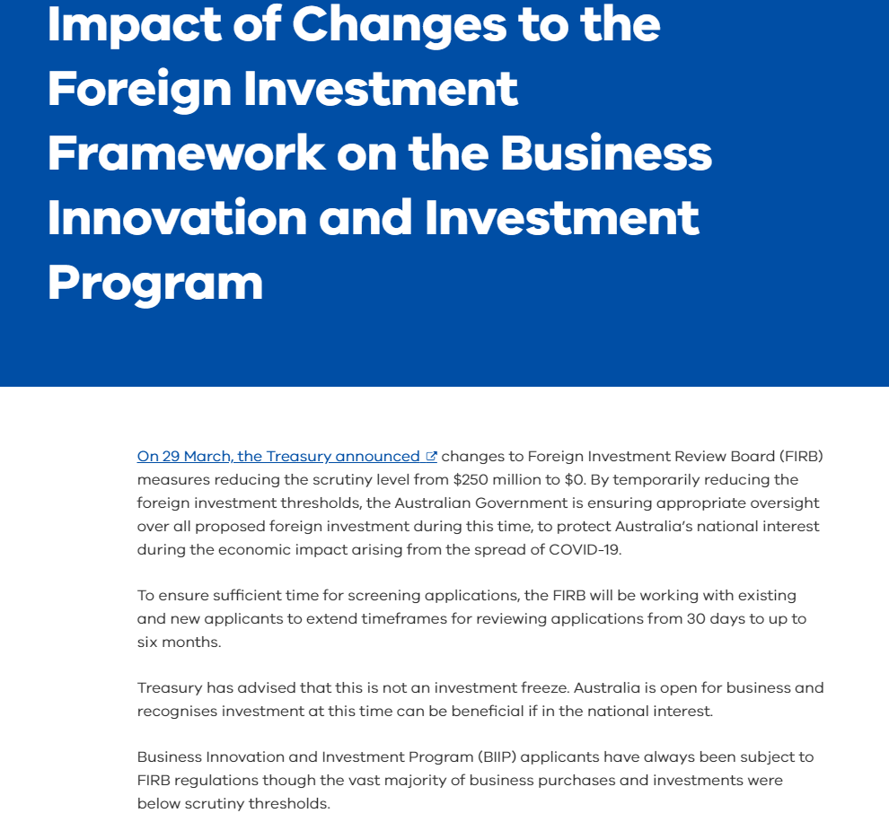 澳洲的商業創新和投資移民(BIIP)的申請者始終受到FIRB法規的約束,盡管絕大多數商業購買和投資均低于審查門檻。
