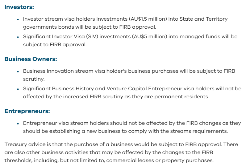 188E創業移民的簽證持有人,由于他們是需要在澳洲建立一個全新的生意來滿足簽證的要求,所以不會受到FIRB政策變化的影響。