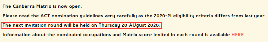 上述新政8月20日開始生效實施,想詳細了解堪培拉州擔保政策的朋友,請立即聯系飛克移民幫您分析、評估。明天堪培拉即將發放最新一輪Matrix邀請,這個效率可以說是相當快了。你想當那個搶先獲邀的幸運兒嗎?那就抓緊時間準備資料第一時間遞交申請吧!
