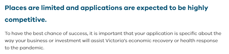 以上政策反映出,維州在受疫情重創以后,急需188/132類別的商業投資人對維州進行后疫情時期的經濟投資,重點在刺激本地經濟復蘇和對疫情的防控上。