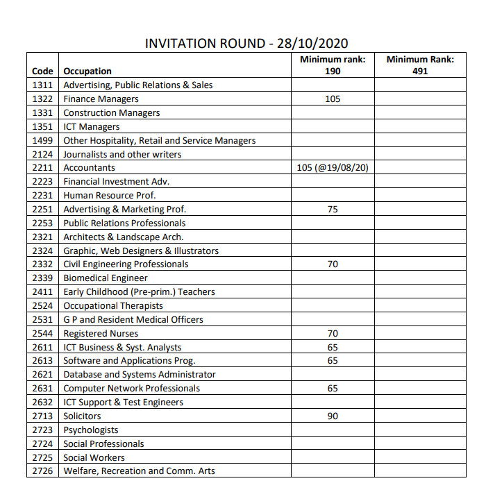 由于ACT分到的45個491擔(dān)保的臨時配額已經(jīng)用完,所以本輪Matrix邀請繼續(xù)全部給到了190,491沒有邀請。而本輪190邀請中,熱門職業(yè)會計、財務(wù)經(jīng)理本輪依舊有發(fā)放。并且會計本輪190降至105分獲邀,財務(wù)經(jīng)理保持105分獲邀,和上輪一樣。廣告和市場營銷邀請分?jǐn)?shù)繼續(xù)降低,僅需75分獲邀;土木工程本輪繼續(xù)70分獲邀,ICT類職業(yè)穩(wěn)定在65分獲邀。經(jīng)過前面幾輪的邀請,ACT的臨時移民配額所剩不多了,所以要申請ACT 190的就抓緊時間吧。