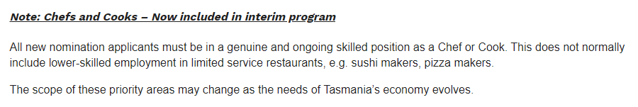 但是,申請者必須是一個真正的且熟練的主廚或廚師,低技能工作,例如壽司師或披薩師通常不包括在內。
