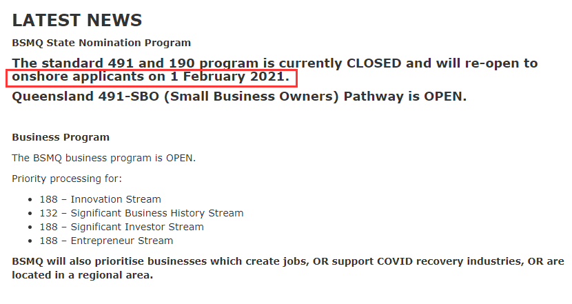 然而,今天昆州官網又通知改了時間,表示491和190州擔保申請通道仍是關閉狀態,要延遲到2月1日重新開放,并且僅針對境內申請人。
