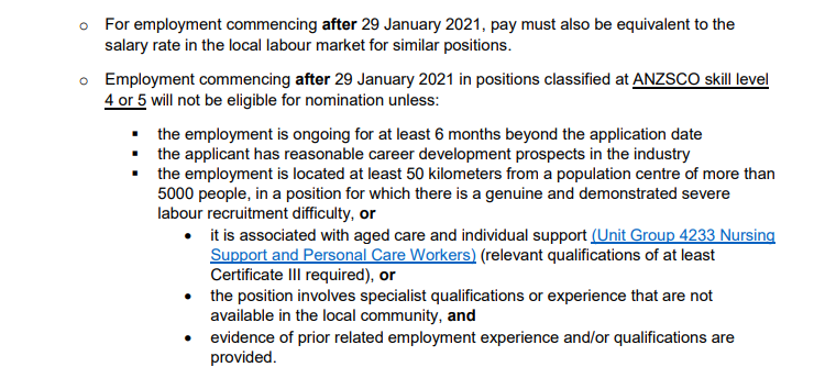4. 2021年1月29日之后開始的工作,如果職位在ANZSCO工作技能等級為4或5級將不符合要求,除非: