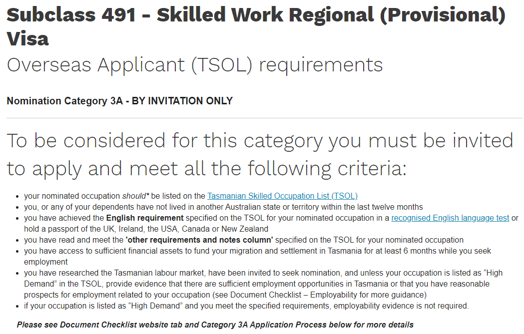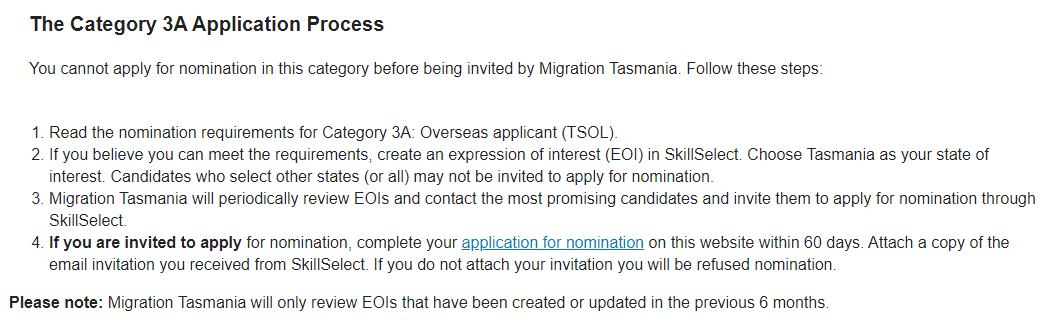在申請(qǐng)流程方面,3A類的申請(qǐng)有重要變化,就是申請(qǐng)人只能在SkillSelect上遞交EOI,等待塔州政府邀請(qǐng)去申請(qǐng)州擔(dān)保提名。