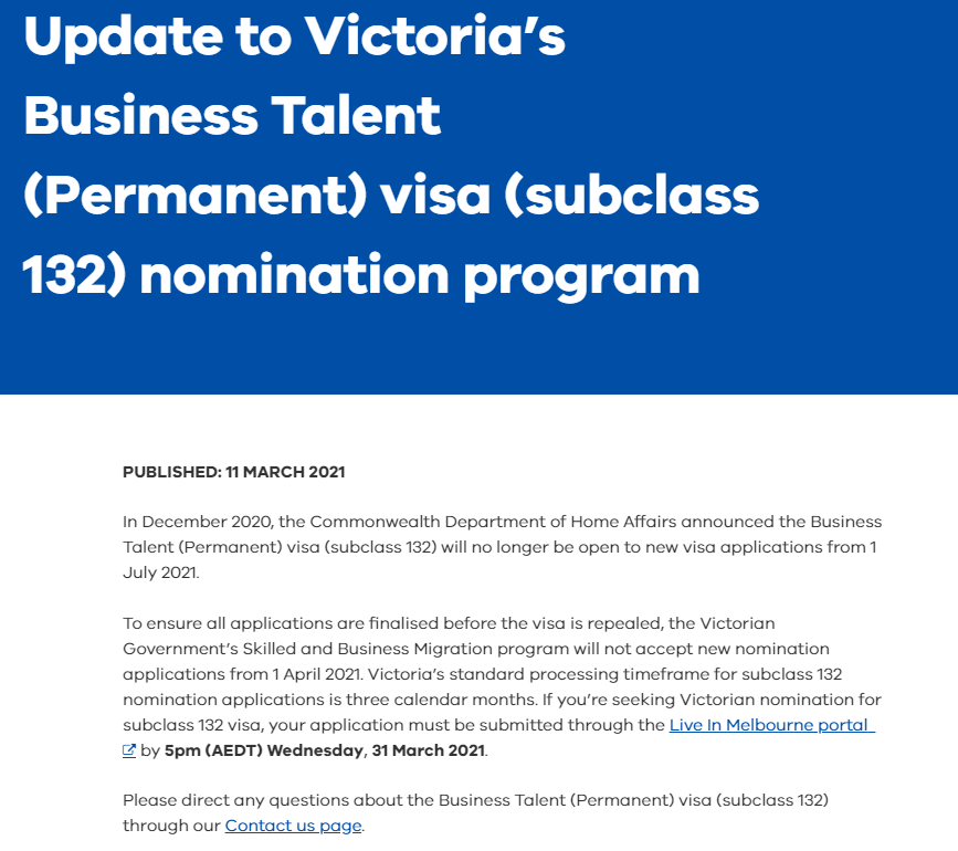 今日,維州州政府發布通知:由于內政部從2021年7月1日起不再接受132商業天才永居簽證申請,為了確保所有的132州擔保申請能在簽證廢除前審理完,維州州政府將從2021年4月1日起不再接受新的132州擔保申請。
