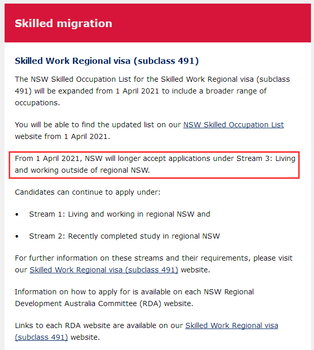 2. 從4月1日起,新州491將不再接受Stream 3:在新州偏遠地區外居住和工作類別的申請。