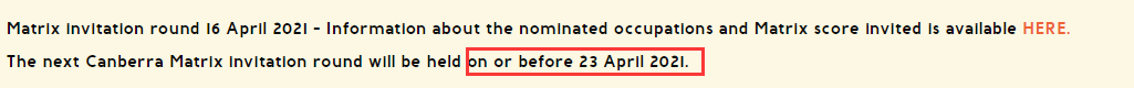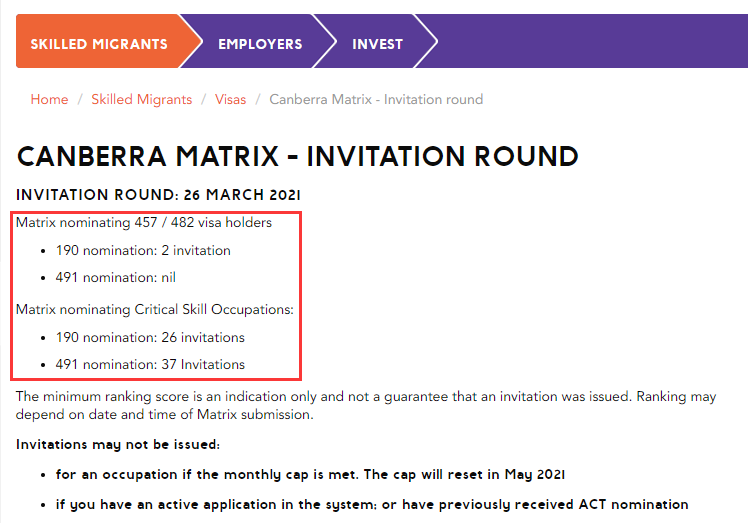 要注意的是,堪培拉Matrix的邀請原則是優(yōu)先邀請Matrix分?jǐn)?shù)較高的申請人,而且每個職業(yè)大類每月的邀請名額有限制,如果當(dāng)月的邀請名額已發(fā)完,當(dāng)月將不再發(fā)出邀請。所以,只有在本組職業(yè)類別中分?jǐn)?shù)越高,排名越靠前,才更有機(jī)會獲邀。