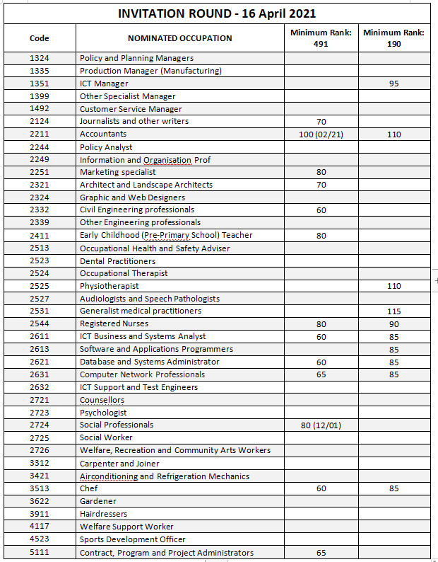 本輪2211會計190最低邀請分?jǐn)?shù)為110分,而491下降5分最低需100分獲邀,并且推進(jìn)到了2021年2月遞交的申請;2251市場營銷和2332土木工程本輪僅發(fā)放了491邀請,2251上漲10分最低80分獲邀,2332最低邀請分?jǐn)?shù)為60分;本輪2544注冊護(hù)士491上漲10分,最低邀請分?jǐn)?shù)為80分,190上漲5分最低為90分;ICT類職業(yè)2611、2613、2621和2631本輪均發(fā)放了190邀請,最低邀請分?jǐn)?shù)均為85分;2611本輪491最低60分獲邀;2621本輪491下降5分最低60分獲邀;2631本輪491下降10分最低65分獲邀。除此之外,本輪還有記者和其他作家、建筑師、幼兒教師等職業(yè)發(fā)放了491邀請,最低邀請分?jǐn)?shù)在60-80分之間。