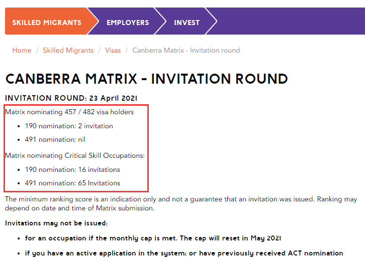要注意的是,堪培拉Matrix的邀請原則是優先邀請Matrix分數較高的申請人,而且每個職業大類每月的邀請名額有限制,如果當月的邀請名額已發完,當月將不再發出邀請。所以,只有在本組職業類別中分數越高,排名越靠前,才更有機會獲邀。