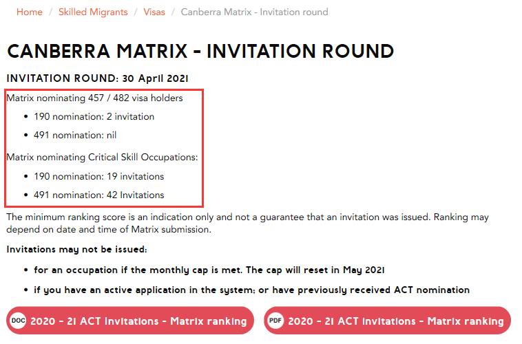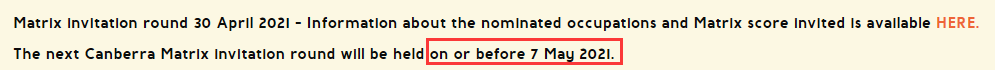 要注意的是,堪培拉Matrix的邀請原則是優先邀請Matrix分數較高的申請人,而且每個職業大類每月的邀請名額有限制,如果當月的邀請名額已發完,當月將不再發出邀請。所以,只有在本組職業類別中分數越高,排名越靠前,才更有機會獲邀。