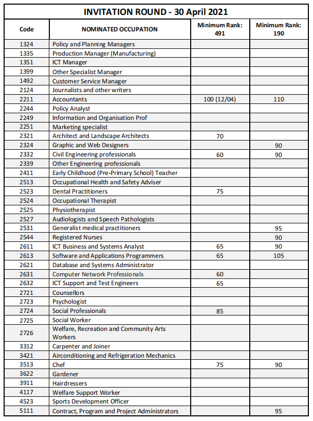 本輪會計491最低邀請分數為100分,而190上漲5分最低需110分獲邀;2332土木工程本輪491邀請最低分數為60分,190上漲5分最低邀請分數為90分;本輪2544注冊護士本輪僅發放了190邀請,最低邀請分數為90分;ICT類職業2611本輪491上漲5分最低65分獲邀,190下降10分最低90分獲邀;2613本輪491上漲5分最低邀請分數為65分,190上漲20分最低分數為105分;2631、2632本輪均僅開放491邀請,最低邀請分數分別為60分和65分;本輪2724社會專業人士491下降5分最低為85分。除此之外,本輪還有建筑師和景觀設計師、牙科醫生、主廚等職業發放了邀請。